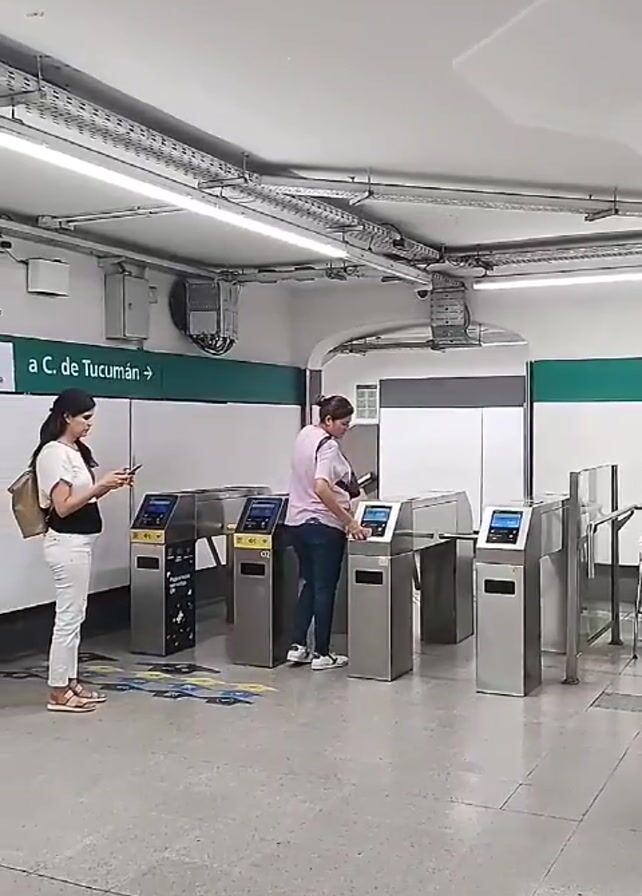 Two women are at the turnstiles of a subway station. The woman to the left, dressed in white pants and a beige shirt, is looking at her phone. The woman on the right, wearing jeans and a pink shirt, has just gone through the turnstile and is walking away. The turnstiles are made of silver metal with black accents. An arrow on the wall points to the right, indicating the direction of C. De Tucumán. The station has white walls, gray floors, and visible wiring on the ceiling.