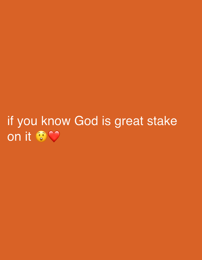 The image displays a solid, uniform orange background. Positioned in the lower-left quadrant are white, sans-serif text and two emojis. The text reads: "if you know God is great stake on it". Following the text are a surprised face emoji (😮) and a red heart emoji (❤️). The scene consists solely of this graphic overlay on a plain background; it contains no visual elements depicting a physical environment, specific objects, people, or actions, and therefore provides no visual information regarding a location in the city of Ikota, Nigeria.