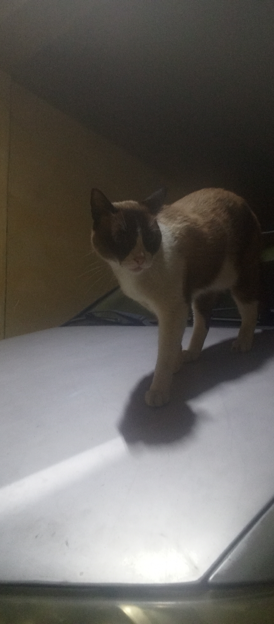 A cat stands on the hood of a car in what appears to be a dimly lit or nighttime setting. The cat is primarily white with brown markings on its head and back. The car's hood is a light color, and there is a vertical streak of light across its surface, creating a distinct shadow of the cat's front legs. The background is dark, with a wall visible to the left. The photograph was taken in Tinaquillo, Venezuela.