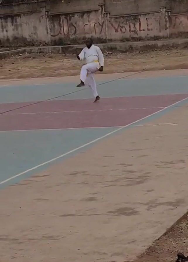 A man wearing a white karate uniform with a yellow belt performs a series of kicks on an outdoor sports court. The court has sections marked in blue, red, and white. Behind the court is a concrete wall with the words "JOS CITY VOLLEY" painted on it in dark letters. The area around the court appears to be a somewhat neglected open space. The camera remains still during the performance.