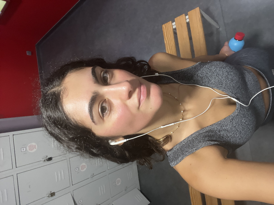 An image depicts a young adult female taking a selfie in what appears to be a gym locker room