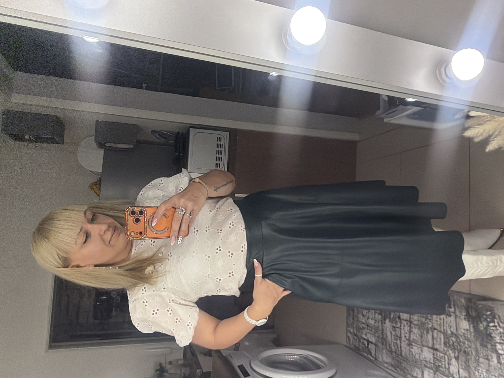 A woman with blonde hair and bangs takes a selfie in front of a mirror with three bulb lights at the top. She is wearing a white, eyelet-style blouse and a black, faux-leather skirt. She holds an orange phone with a decorated case. Her right hand is near her waist, and her left hand is raised holding the phone. The background features interior elements including a mirror-lined wall, cabinets, a small appliance that appears to be a microwave, a bed with white pillows, and a vanity area with a round light. The location is indoors, possibly a personal dressing area in Chaikovsky, Russia.