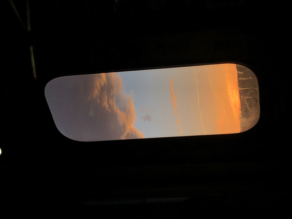 An elongated, slightly blurry rectangular window shows a dramatic sky. Light blue transitions to orange and gold at the right, possibly indicating sunrise or sunset. Dark, textured clouds occupy the left portion of the frame. The rest of the image surrounding the window is in deep shadow, revealing parts of a frame that could belong to a car’s roof or some other dark interior space. The window glass appears dirty or scratched, adding to the atmosphere.