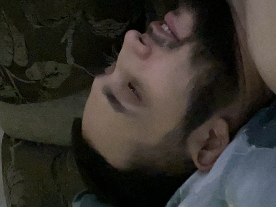 A young person lies on a patterned couch, their head resting on a blue and white pillow. Dark hair frames their face, and they gaze upwards with one eye visible. Their lips are slightly parted, revealing their teeth. The couch features a dark, floral-like design. The image has a slightly low-lit, intimate feel.