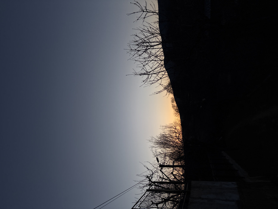 The image depicts a twilight scene, likely either dawn or dusk, over an area within Kyustendil, Bulgaria. The upper two-thirds of the frame consists of a clear sky exhibiting a gradient from dark blue-grey at the zenith, transitioning to a pale orange-yellow hue along the horizon line, indicative of low sunlight. The lower third of the image is dominated by dark silhouettes against this lighter sky. In the left foreground, a segment of a concrete or stone wall is visible, topped by a dark, chain-link or mesh fence structure. Utility lines, possibly power lines, extend diagonally downwards from the upper left corner. Adjacent to this structure, numerous bare, deciduous tree branches are silhouetted, extending upwards into the sky. A street light pole with a luminaire, unlit, is visible amongst the branches slightly right of center-left. The midground features an extensive dark silhouette of leafless trees and dense shrubbery, suggesting a winter or early spring season. In the background, a distinct, dark silhouette of a mountainous or hilly landscape rises against the orange-yellow horizon light, providing depth to the scene. No individuals, specific actions, or interactions are discernible within the frame. The overall environment suggests a residential or semi-rural setting.