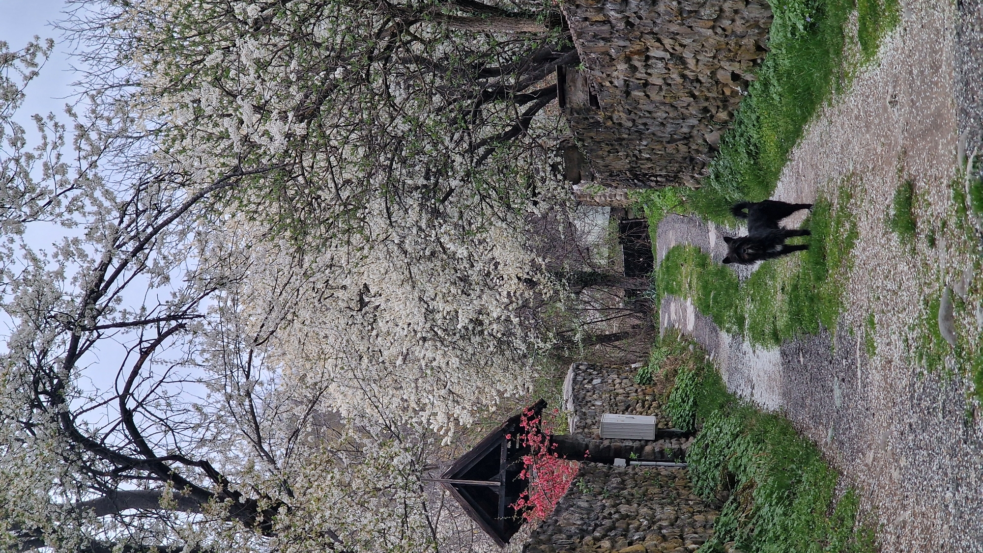 The image is a landscape photograph taken in Apriltsi, Bulgaria, showcasing a narrow, gravel path flanked by stone walls and abundant vegetation. The path, slightly wet, is bordered by green grass and other plants, suggesting recent rain or a damp environment. On the right side of the path stands a black dog, facing the camera with a neutral expression. Its breed is not immediately identifiable, but it appears to be of medium size with shaggy fur. To the left of the path, a structure with a dark wooden roof and stone walls is visible. This structure, possibly a small shed or well covering, is adorned with blooming pink flowers. Above and behind this structure, a large tree with blossoming white flowers dominates the scene, its branches reaching across the frame. The stone walls lining the path are constructed from irregular-sized stones, indicating traditional building techniques. The overall environment suggests a rural or semi-rural setting. The sky is overcast, casting a soft, diffused light across the scene.