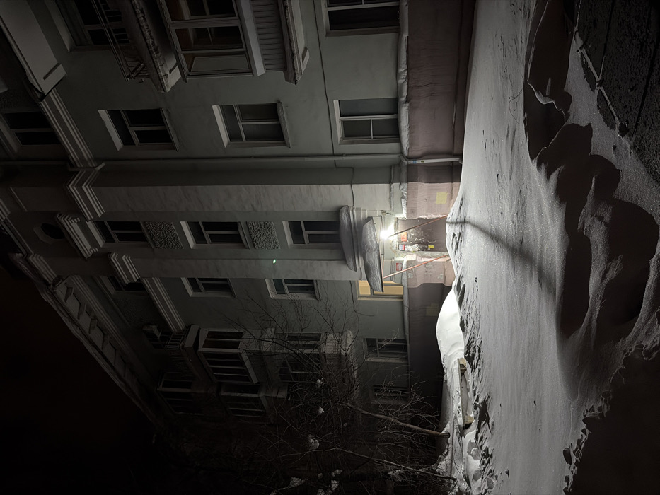 A tall, light-grey building is seen at night, with numerous windows and decorative moldings. To the right, a massive pile of snow extends into the darkness. The scene is illuminated by a bright light source situated within the building, casting shadows. A bare tree branch is visible in the lower portion of the frame, silhouetted against the darkness. The image is rotated, making the building appear diagonal.