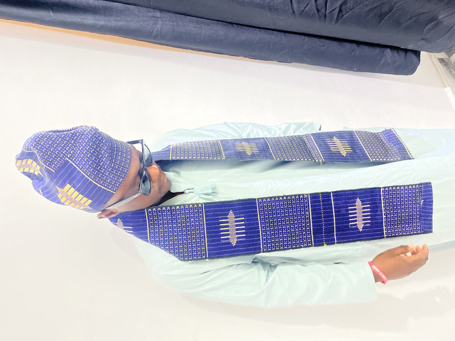 A male individual is depicted standing against a white wall in Joma, Ghana. The subject is wearing a light blue long-sleeved tunic featuring a V-neckline with a matching light blue tassel. On his head, he wears a dark blue knit cap with gold geometric patterns. A dark blue scarf with intricate woven gold and white patterns is draped around his neck and extends down the front of his torso. Dark, rectangular sunglasses obscure his eyes, and his head is angled downwards. A pink wristband is visible on his left wrist. To the right of the subject, a dark blue or black fabric, possibly a curtain, partially covers the white wall.