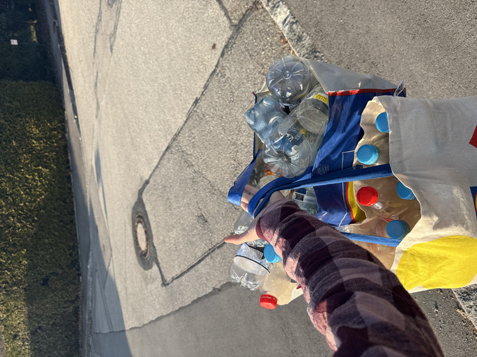A person's right arm and hand, clad in a maroon and white plaid long-sleeved shirt, are visible in the foreground, holding the handles of two reusable shopping bags. The prominent bag is a blue tote, nested within or alongside a cream-colored fabric tote bag featuring a yellow circle and red lettering, indicative of a Lidl brand bag. Both bags are filled with numerous clear plastic bottles, predominantly empty, some with blue caps and others with red caps. The bags are positioned over a grey asphalt surface, which comprises a street or paved pathway. This asphalt displays minor cracks and a worn appearance. Centrally in the midground, a circular metal manhole cover is embedded in the pavement, surrounded by a distinct rectangular outline painted in black. Long shadows of the bags and potentially the person carrying them are cast across the asphalt, stretching towards the lower right. In the background, a dense, dark green hedge or row of shrubs borders the street, under bright sunlight which illuminates the scene from the upper left. The environment is outdoor and appears to be a residential or urban street. The scene is set on an asphalt street in Gauting, Germany.