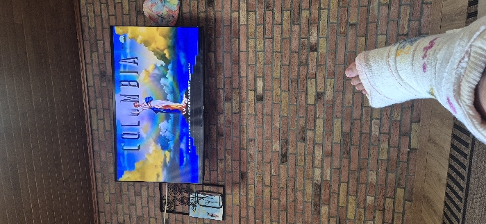 An indoor scene in Melle, Belgium, depicts a television displaying the Columbia Pictures logo, mounted on a reddish-brown brick wall. In the lower right foreground, a human leg and foot encased in a white plaster cast, adorned with faint colorful markings, are visible. The ceiling above consists of dark brown horizontal slats. To the immediate left of the television, a black metal decorative scrollwork piece and a rectangular artwork depicting a blue jar are affixed to the brick wall. A portion of a patterned spherical object is partially visible to the right of the television. The floor in the bottom left corner features a dark surface with parallel lighter stripes.