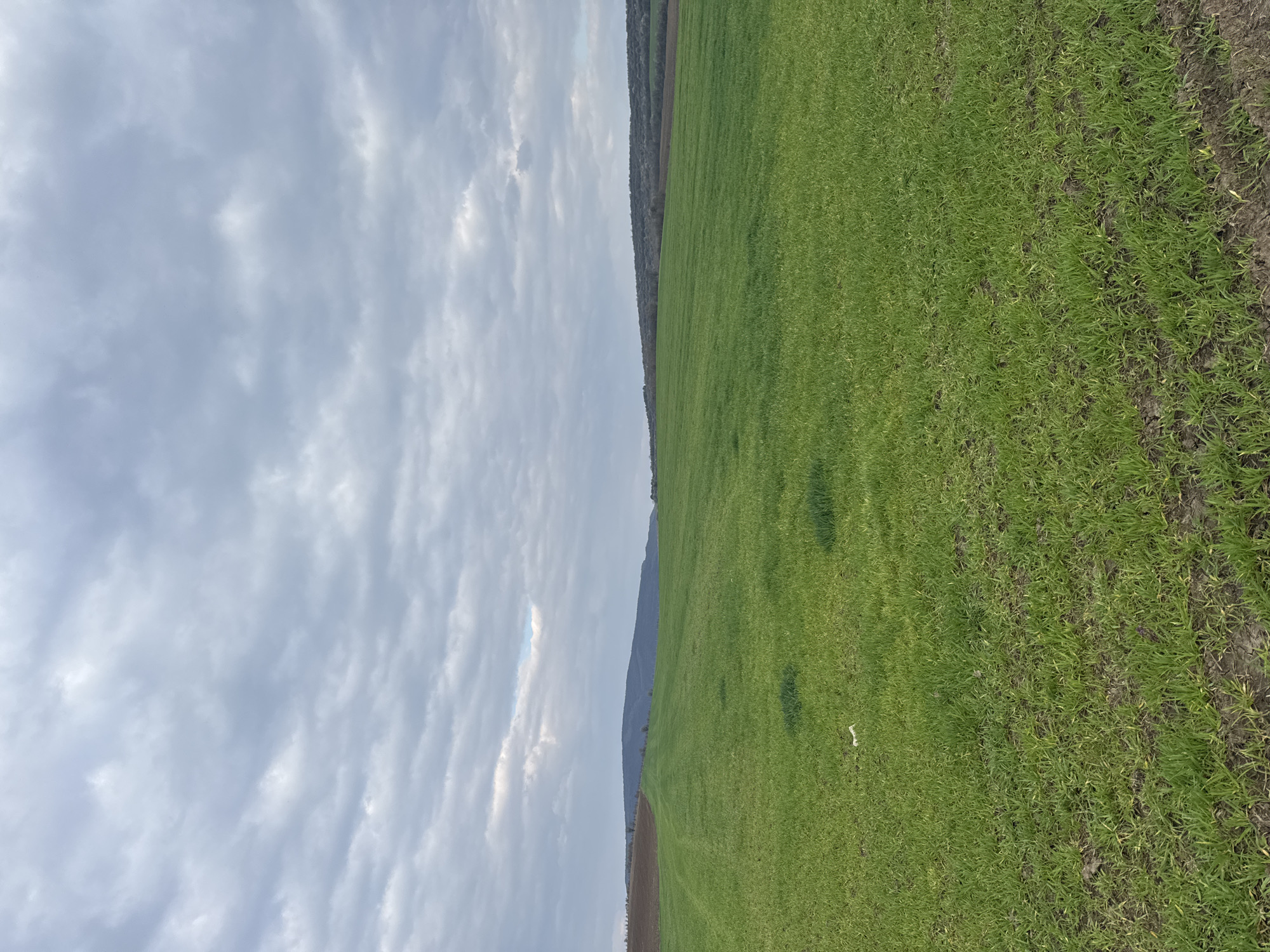 A rural scene in Djulunitsa, Bulgaria, depicts an expansive agricultural field under an overcast sky. The foreground and midground are covered with light green vegetation, consistent with young crops, emerging from dark brown soil. Scattered clumps of slightly denser green vegetation are present. A small, white, irregular object lies on the ground in the mid-left foreground. Towards the left edge of the midground, a section of bare, dark brown tilled earth is visible. The distant horizon features undulating terrain, appearing as hills or low mountains, densely covered with dark, indistinct vegetation. The sky is covered by grey and white stratus and stratocumulus clouds, with a singular, brighter patch of sky visible through a gap in the clouds towards the upper left quadrant. No individuals, animals, structures, or machinery are present.