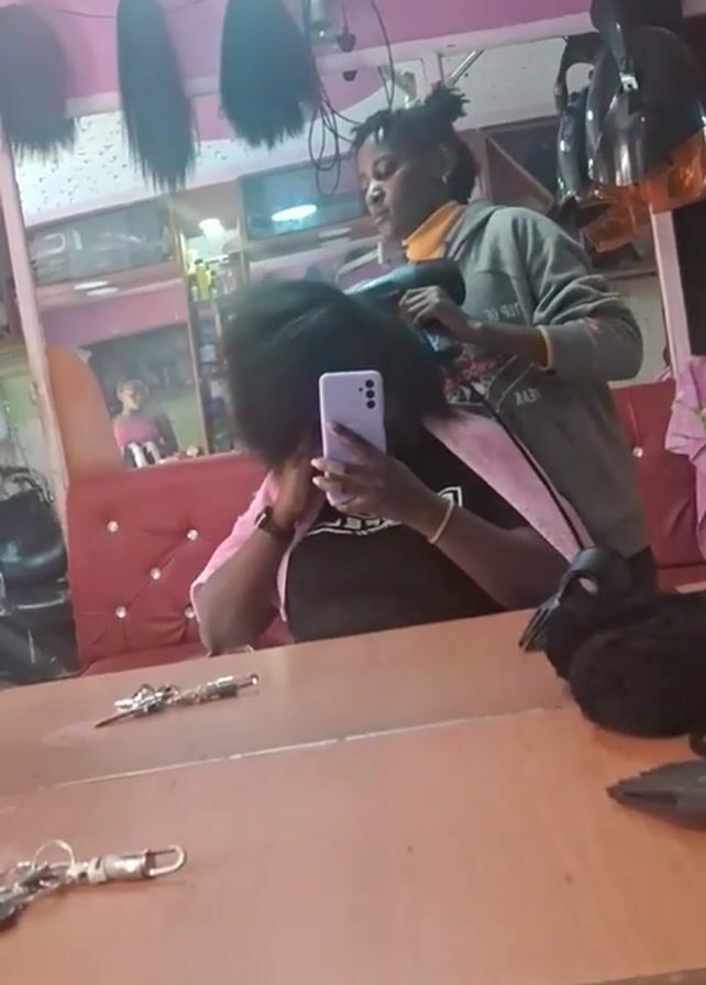 The video is a medium shot taken in a hair salon, reflected in a mirror