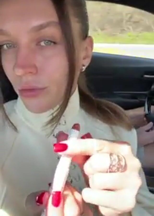 A woman with green eyes and red fingernails is applying lip balm in a car. The woman is wearing a white top with a lace-up neckline. The background shows trees and other cars, suggesting she is in a moving vehicle. A hand can be seen in the background near the steering wheel.