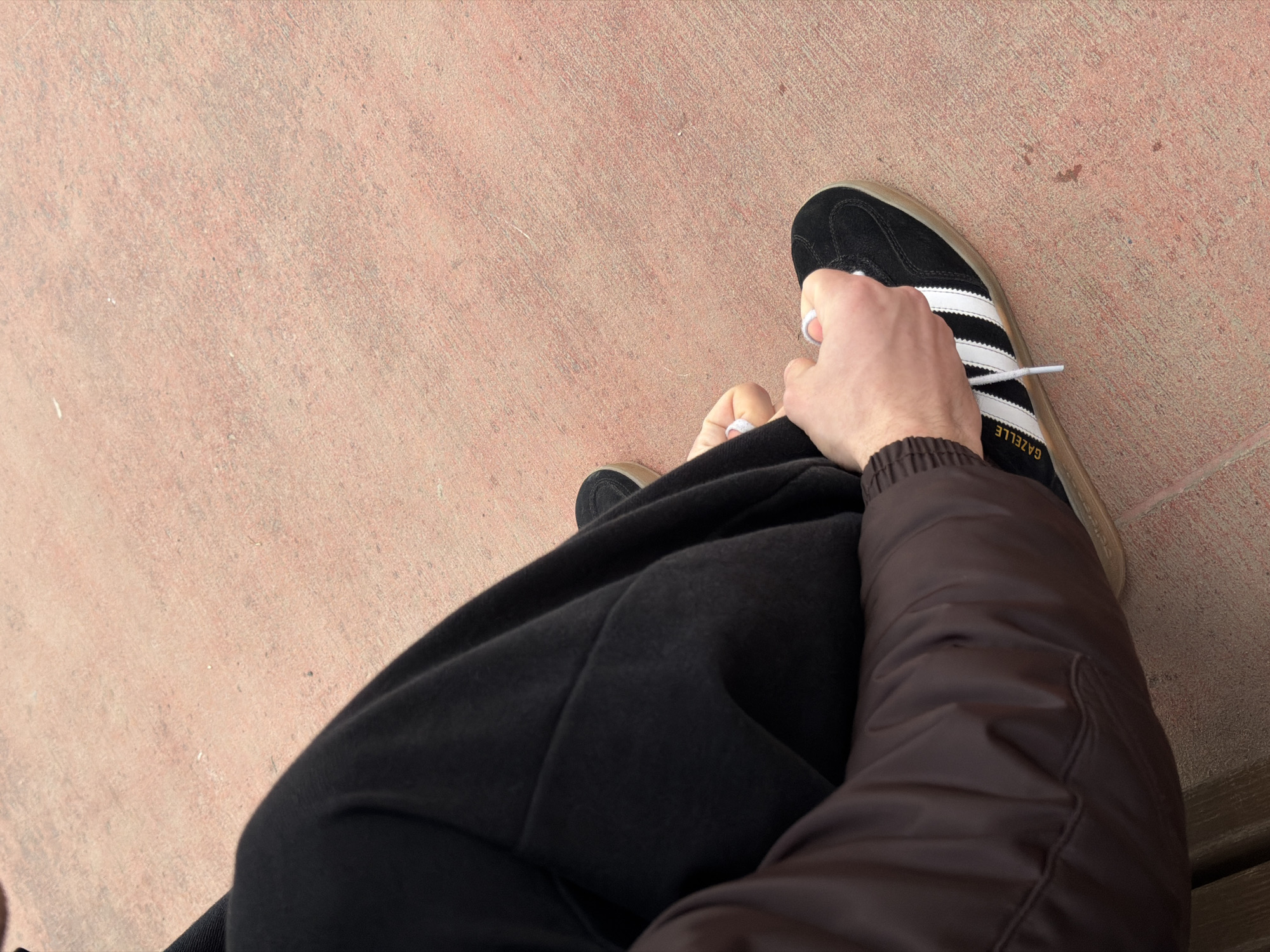 A first-person perspective image shows a person sitting outdoors, tying the laces of a black Adidas Gazelle shoe with white stripes. The shoe is on a tan concrete surface. The person is wearing black sweatpants and a brown puffer jacket. A partial view of what appears to be a wooden bench is visible at the bottom of the image. No elements in the image allow for determining the location.
