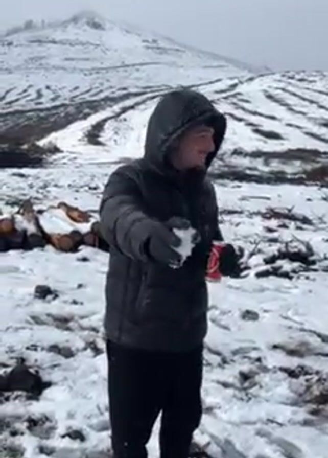 In a snowy landscape, a man stands wearing a black hooded puffer jacket, black pants, and brown boots. He has gloves on, holding a snowball in one hand and a Coca-Cola can in the other. In the background, a snow-covered hill can be seen with lines of trees. To the left, there are logs and some scattered debris on the ground. The man waves his hand to the camera while holding the coke can. The weather appears to be overcast.
