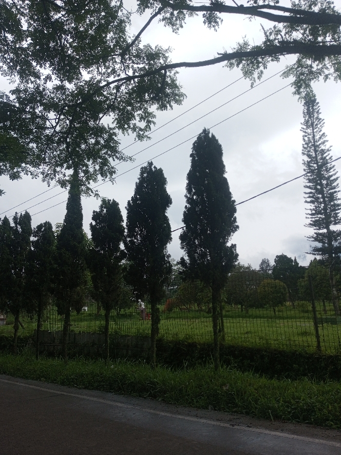 A roadside view features a row of tall, slender, dark green trees lining a wire fence, beyond which lies a grassy field dotted with other trees and shrubs. Overhead, bare tree branches extend across the sky, with utility wires also visible. The sky is overcast, casting a soft, diffused light over the scene. In the foreground, the edge of a road is visible.