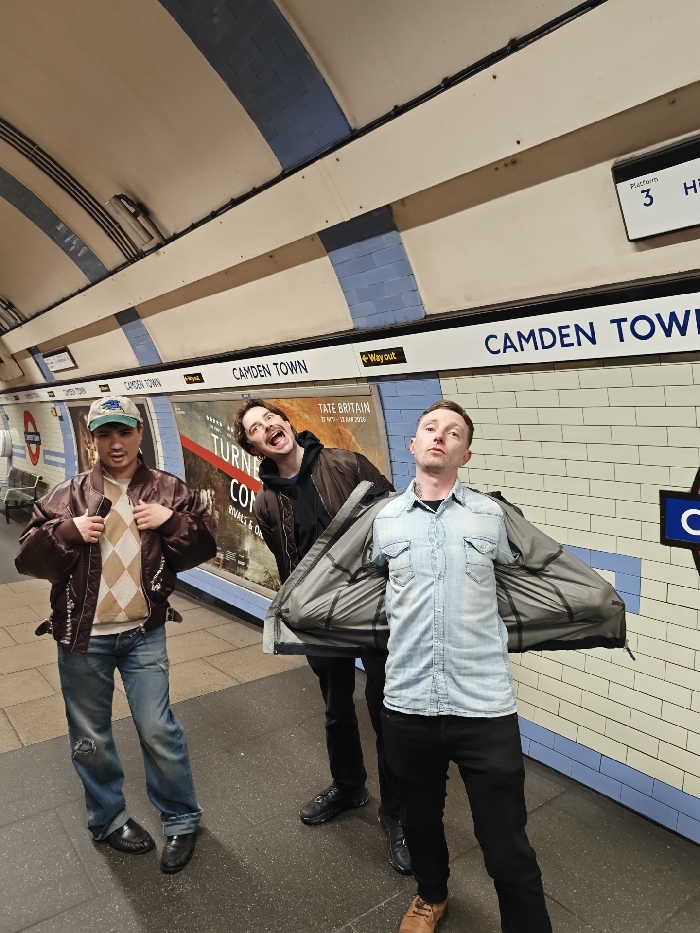 Three men are standing in a subway station. One wears a brown bomber jacket and jeans, another a denim shirt and black pants while holding his jacket open, and the third a brown jacket and black pants. The station is Camden Town, as indicated by the signage. A poster for a Tate Britain exhibition titled "Turner" is visible in the background, and a sign indicates Platform 3.
