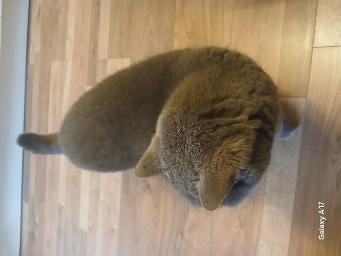 - "The image displays a gray, short-haired cat viewed from a high angle, situated on a light-colored wooden plank floor" by FM-MZ8Xp1, licensed under CC BY 4.0