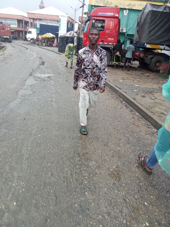 The image captures a street scene in Satellite Town, Nigeria, under overcast conditions with a wet asphalt road surface featuring puddles