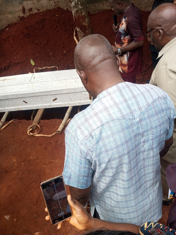 The image portrays an outdoor burial scene in Oko Town, Nigeria. In the foreground, the back of a bald male individual is visible, wearing a light blue and white checkered short-sleeved shirt, with his head bowed, looking downwards. A hand in the lower left holds a black smartphone, actively displaying a camera interface with vertical lines, indicative of a video recording in progress. In the mid-ground, a white coffin with dark rectangular accents rests horizontally on two wooden or bamboo supports, suspended over an excavated grave pit. Beige rope-like material is looped around these supports. The ground surrounding the grave consists of loose, reddish-brown soil. Behind the foreground individual, two other men are partially visible. One man to the left wears a dark reddish-brown patterned shirt and holds a black microphone. The other man to the right wears a light tan shirt and glasses. Both are also looking downwards. A tree trunk stands on the left side of the scene, and a concrete wall borders a mound of soil in the upper left background.