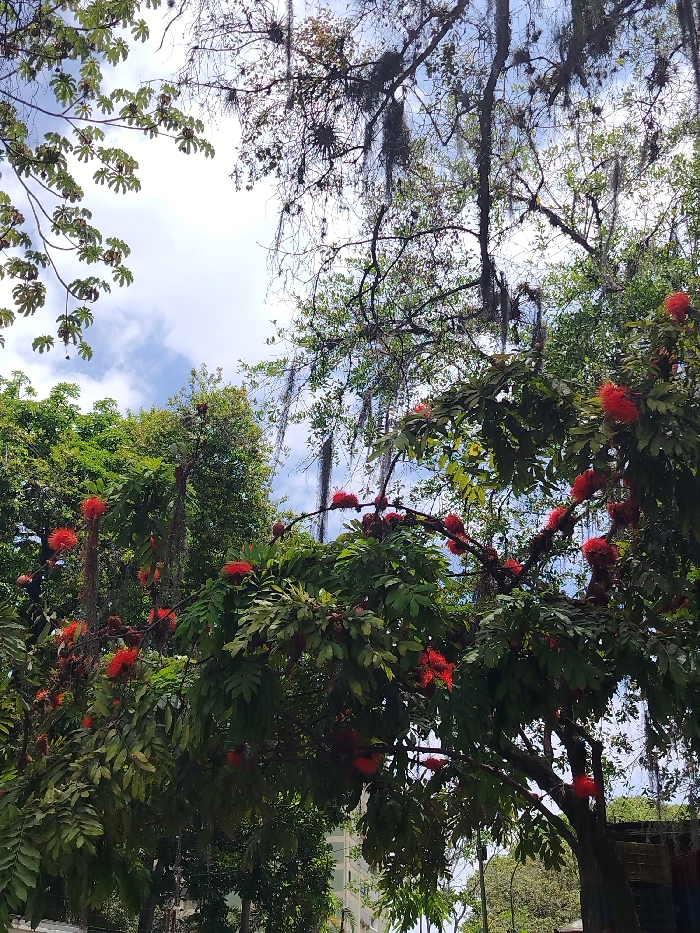 The image presents an upward view into a dense tree canopy against a partly cloudy sky, located in an urban area of Los Teques, Venezuela. A prominent tree in the mid-ground and foreground exhibits numerous bright red, spherical, brush-like flowers amidst dark green, compound leaves. Another tree with large, light green, palmate leaves is visible on the left. Multiple tree branches in the upper frame are heavily draped with epiphytic growths, including strands resembling Spanish moss. Patches of blue sky with scattered white clouds are visible through the foliage. In the lower-left background, parts of a light-colored building are discernible through the leaves, while hints of urban infrastructure are partially visible on the far right. No people or animals are observed.