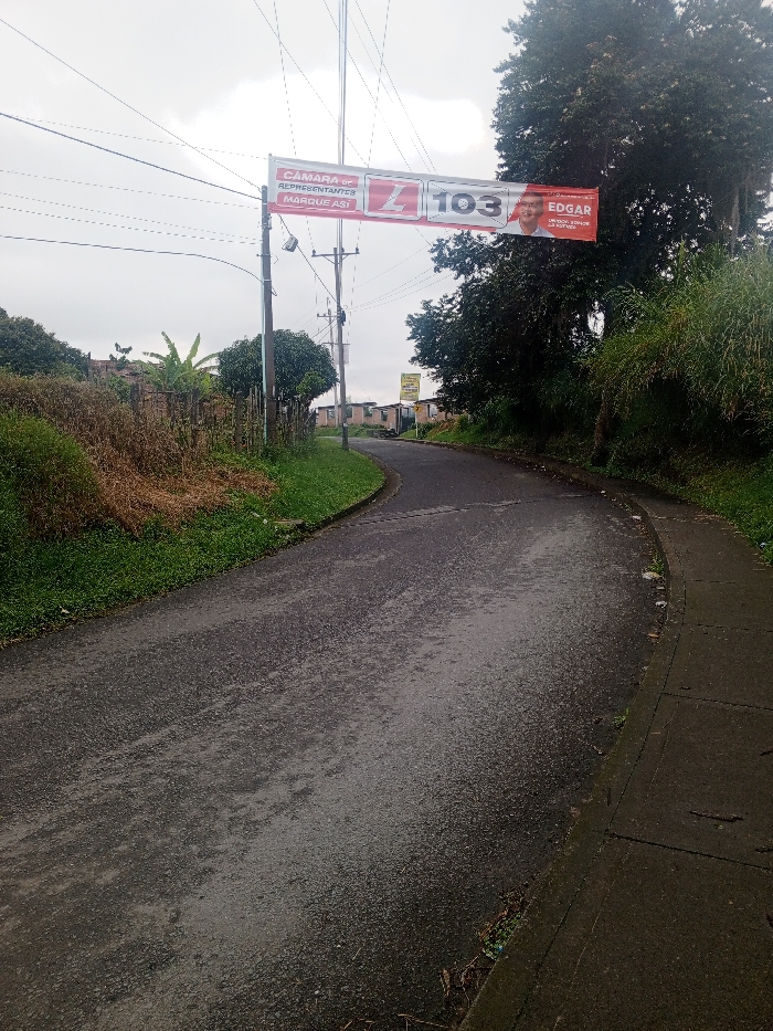 The image displays an overcast daytime scene of a curving asphalt road in a residential or semi-urban area of Popayán, Colombia