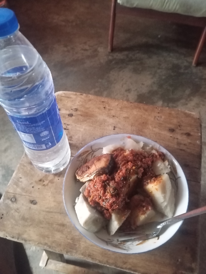 This image depicts a prepared meal set on a rustic wooden stool, within an indoor environment in Okere-Urhobo, Nigeria