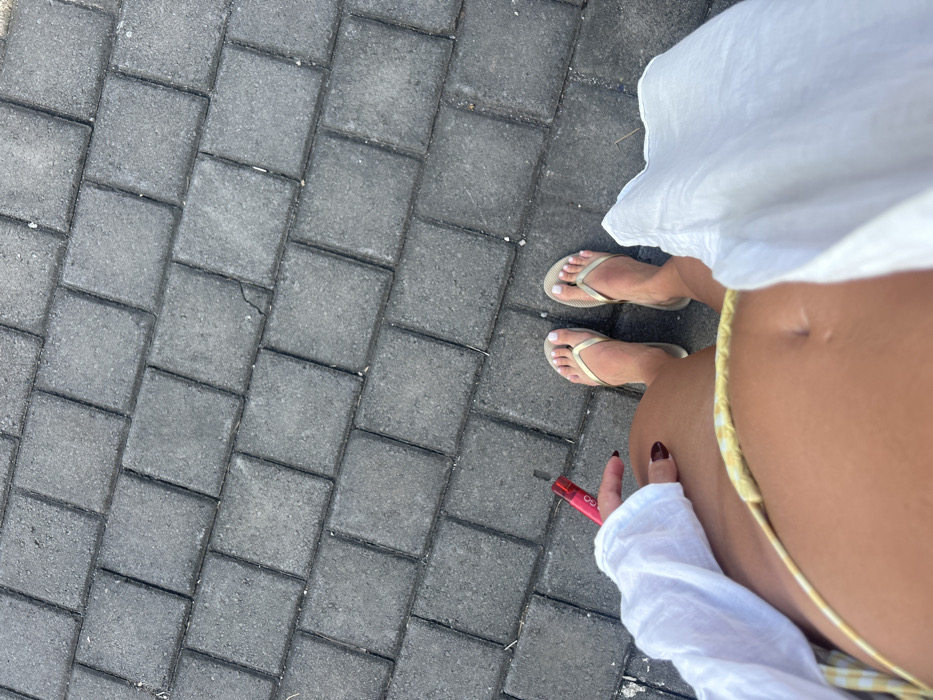 An overhead shot depicts a person standing on a grey paved surface in Uluwatu, Indonesia. The pavement consists of interlocking rectangular pavers. The individual's lower torso, legs, and feet are visible. They wear a yellow and white plaid bikini bottom, a white loose-fitting long-sleeved shirt/cover-up, and light gold flip-flops. Their toenails are painted white. A red, translucent cylindrical object, appearing to be a "VGO" branded disposable vape, is held in the person's left hand, which has dark red fingernail polish. The navel is exposed, and the skin appears tanned.