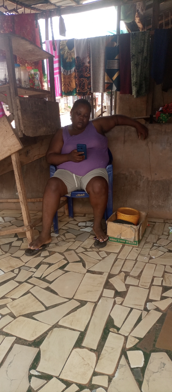 A dark-skinned adult female, appearing to be in her 30s-40s with a plump build, is seated on a blue plastic monobloc chair. She is dressed in a purple sleeveless top and light-colored shorts with a white drawstring. Her toenails are painted white, and she wears black flip-flops. She holds a dark blue smartphone in both hands, looking downwards at the device, with her eyes appearing closed or cast low. Her right forearm rests on a cracked concrete wall to her right. To her left, a rough wooden shelf structure with multiple levels holds clear plastic containers, some containing colorful items. Overhead and behind her, various patterned fabrics and textiles are suspended from lines, suggesting merchandise. The setting is under a corrugated metal roof, partially visible, indicating a covered outdoor stall or market area. On the floor to her right, a brown cardboard box, partially labeled "EXTRA ROLL FREE," contains a yellow plastic bowl and another dark, unidentifiable object. The floor is paved with irregular, light-colored flagstones or broken tiles set into dark mortar. The scene takes place in Nkpor, Nigeria, likely within an open-air market or roadside retail establishment.