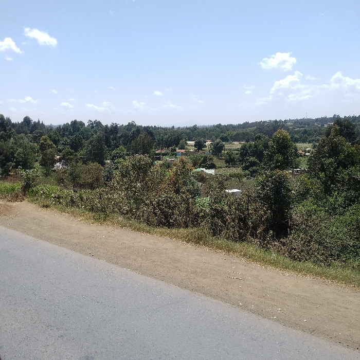 The image presents an elevated, outdoor daytime scene under a clear blue sky with scattered white cumulus clouds. In the foreground, an asphalt road surface occupies the lower left section, angling upwards towards the right. Adjacent to the road, a strip of packed dirt and sparse vegetation forms the immediate shoulder, extending rightwards. The midground is dominated by dense, mixed green foliage, including various trees and shrubs, obscuring a direct view of the terrain beyond. Interspersed within and beyond this vegetation, several single-story residential structures with light-colored or reddish roofs are partially visible, indicating a developing settlement. The background features a continuous expanse of dense green trees and distant hills, receding towards a hazy horizon line, characteristic of a heavily vegetated landscape. No individuals, vehicles, or specific human activities are observable. The environment suggests a transition zone between natural landscape and residential expansion. This scene is characteristic of a peri-urban or semi-rural area on the outskirts of Nairobi, Kenya, where natural vegetation meets expanding residential development.