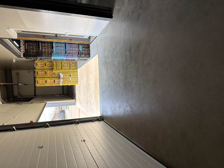 The image depicts the interior of a commercial or industrial facility, likely a warehouse or storage area, located in Nikolaevo, Bulgaria. The perspective is from inside, looking forward and slightly towards an open overhead bay door on the left, which reveals an outdoor street scene. The foreground consists of a dark grey concrete floor, transitioning to a lighter grey where natural sunlight enters through the open bay door. On the immediate left, the lower panels of a partially open white sectional overhead door are visible, featuring horizontal ribs and internal mechanism components. Sunlight illuminates the inner surface of this door. Through the open bay door, an asphalt or dirt road is visible, bordered by distant buildings with orange-brown roofs, indicative of residential or small commercial structures. A white vehicle is partially visible on the street. The sky appears clear, suggesting daylight conditions. To the right of the central passage, within the interior of the facility, multiple stacks of plastic crates are present. Several tall stacks of yellow plastic crates are arranged, containing items, some individually wrapped in white material. Adjacent to these are stacks of darker plastic crates, including black, blue, and purple units. These crates also contain items, and some bear labels in Cyrillic script, such as "ДАРЫИ" (DARII), "ВЕТИ - ФООД" (VETI - FOOD), "КРАСИМИРА", and "НИ - АГРО", suggesting product types or distributor names. Above the crates, industrial ceiling elements including exposed wiring, conduit, and a fluorescent light fixture are visible. To the far right, a vertical white panel wall, possibly part of a refrigerated unit or internal office space, features a closed white door. No individuals are present in the scene, which appears static.
