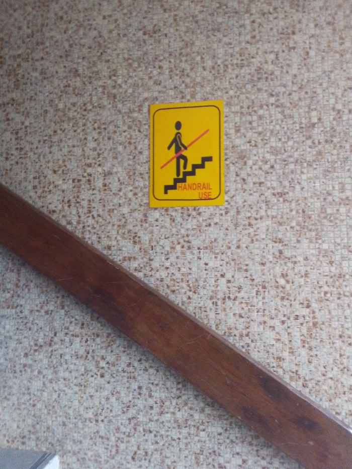 - "This image captures an interior scene in Falomo, Nigeria, depicting a safety sign and a wooden handrail against a tiled wall" by FM-NqVRd2, licensed under CC BY 4.0
