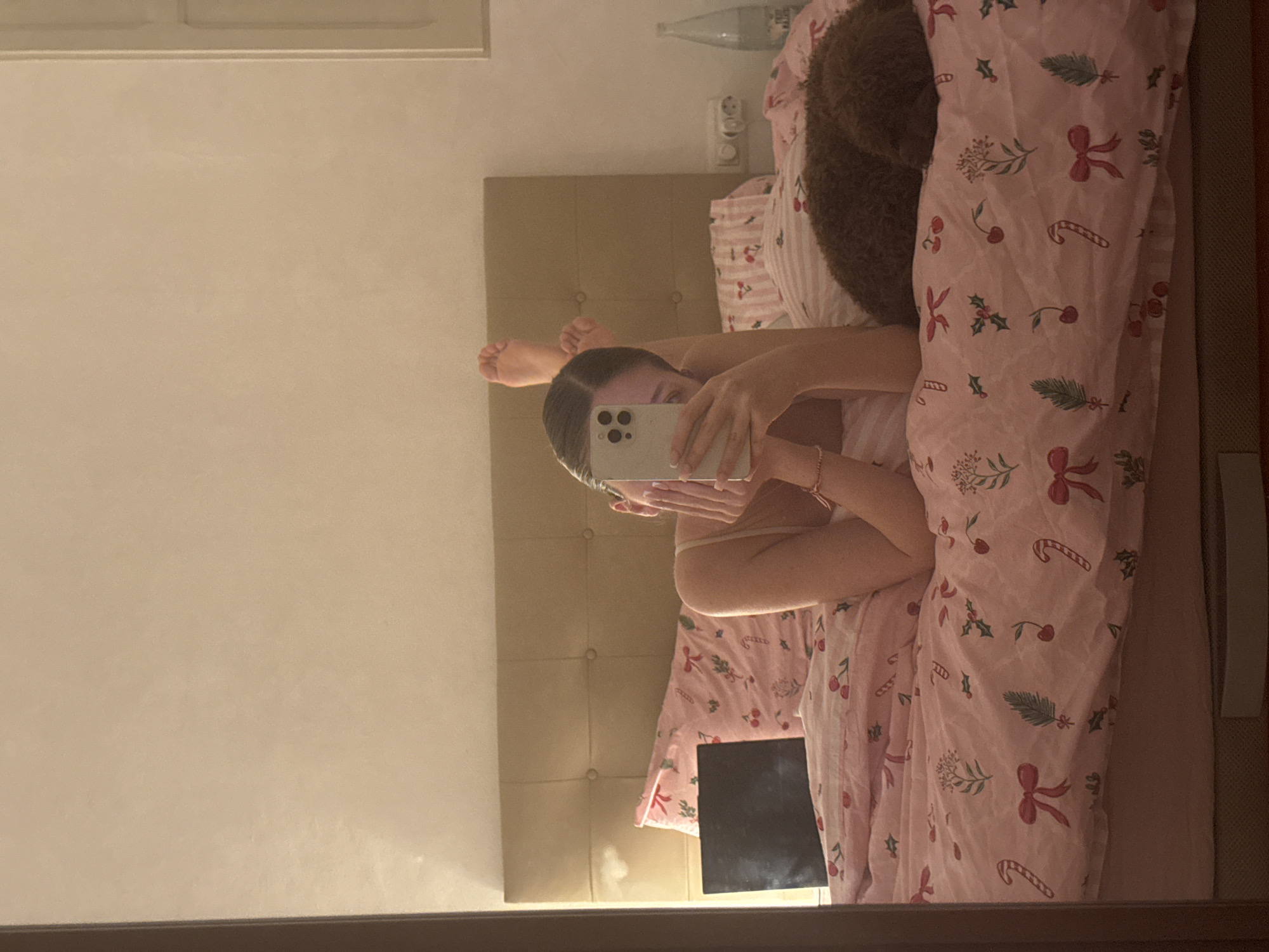 This image depicts an interior bedroom scene, presumably located within L'hospitalet De Llobregat, Spain. A female individual is observed lying prone on a bed, positioned to take a mirror selfie. Her face is obscured by a light-colored smartphone held in both hands. She wears a light-colored tank top, and her feet are visible, raised and crossed at the ankles. A reddish-orange bracelet is present on her right wrist. The bed features a light brown, tufted headboard and is covered with pink bedding adorned with a festive pattern of red bows, green candy canes, and botanical elements. To the left of the female, a black laptop or tablet rests open on a pillow. To her right, a dark brown, curly-haired dog is curled up and resting on the bed. A clear glass water bottle is visible on a surface to the far right, next to a white wall-mounted power outlet. The room exhibits soft, warm lighting. The image captures a reflection in a mirror, indicated by the framing on the left edge.