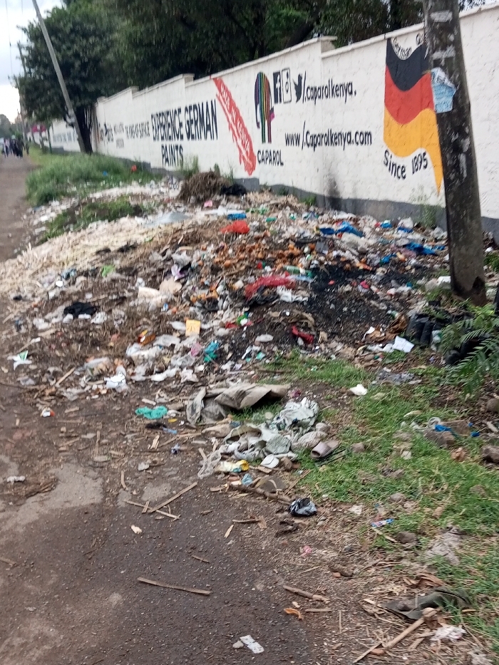 This image depicts a polluted roadside area in Nairobi, Kenya, marked by an extensive accumulation of mixed waste