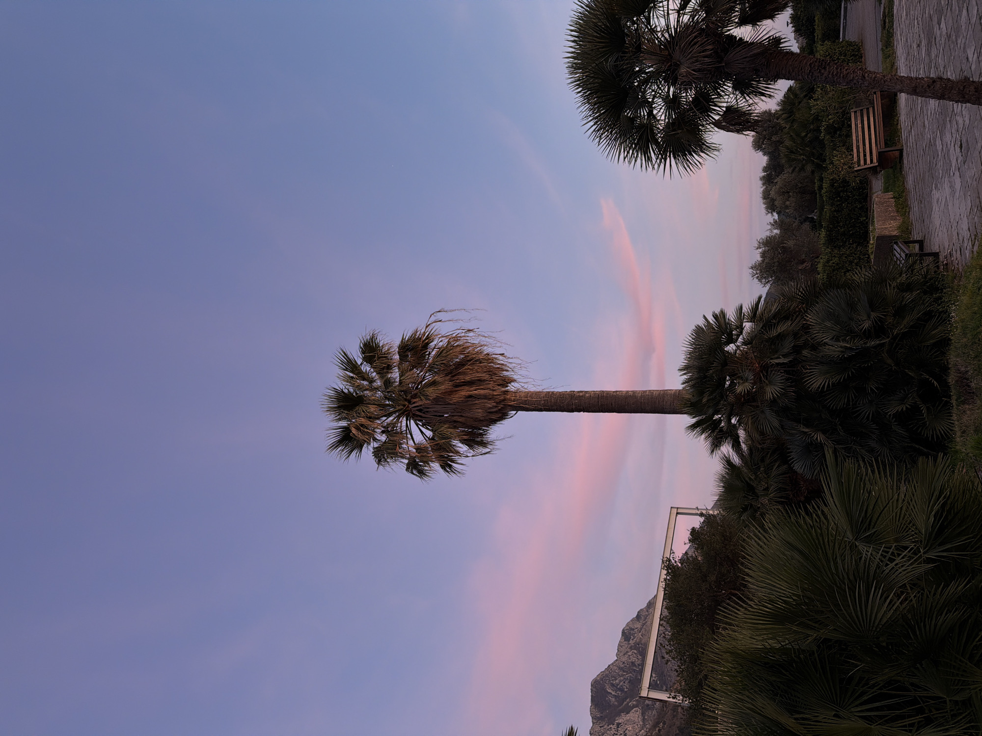 The image depicts an outdoor landscaped area in Sveti Stefan, Montenegro, at either dusk or dawn. The sky occupies the upper two-thirds of the vertical frame, transitioning from light blue at the top to a purple-pink gradient towards the horizon, with wispy pink clouds visible primarily in the middle left. Dark, rugged mountains are silhouetted against the sky in the upper left background. The lower portion of the scene is dominated by dense, dark green subtropical vegetation. A tall palm tree with a slender trunk and a crown of fronds stands centrally. Other palm trees and various bushes are densely distributed across the foreground and mid-ground. Man-made elements include a paved pathway extending from the right foreground, upon which a dark wooden park bench with a slatted back and seat is positioned. To its left, a square concrete structure, possibly a planter, is visible, adjacent to a partial view of another dark bench. In the middle left, partially obscured by foliage, a large, rectangular white metal frame structure is present. No individuals or animals are observed in the scene.
