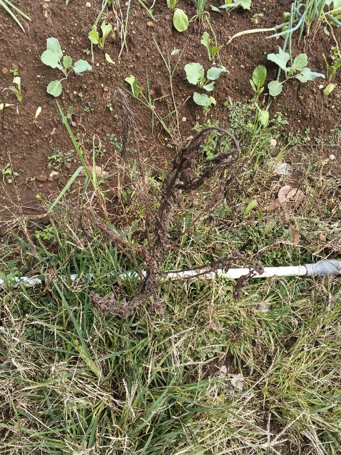 A garden bed exhibits young, leafy green plants in the upper region against dark soil. A dried, brown, skeletal plant stands prominently in the middle, surrounded by dense green grass. A white PVC pipe lies horizontally amidst the grass in the foreground, adding a contrasting element to the natural setting. The scene suggests a mixture of cultivated plants, weeds, and an irrigation system in a domestic garden.