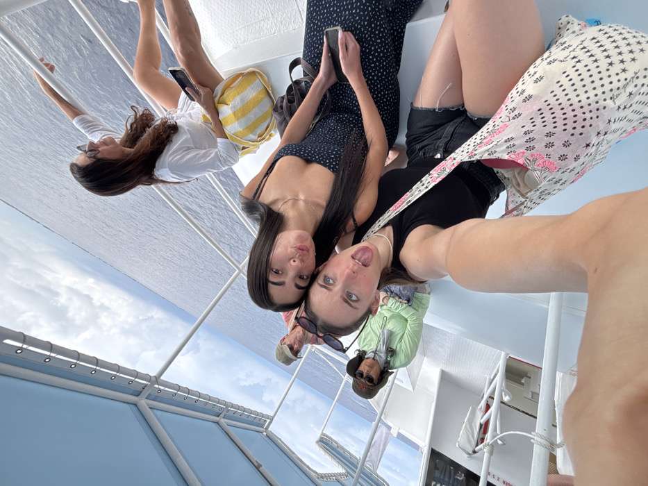 The image depicts five individuals on a white passenger boat on open water off West Bay, Cayman Islands. The scene is a selfie, with the primary subject, a young adult female with light brown hair, visible from the chest down in the foreground. She wears a black tank top and dark shorts, with a white, pink, and black patterned tote bag over her left shoulder. Her expression shows her tongue slightly extended and eyes gazing upwards; sunglasses are perched on her head. Immediately to her right, a second young adult female with long dark hair, wearing a dark blue patterned dress, holds a smartphone in her left hand and displays pouting lips towards the camera. Behind them, an older adult female in a light green long-sleeved shirt and a wide-brimmed hat is seated on the left, and an older adult male in a light-colored polo shirt and baseball cap is partially visible behind her; both wear sunglasses. On the right side of the boat, a third adult female with long dark hair, wearing a white long-sleeved shirt, is seated, holding a smartphone, and observing the water with her right arm resting on the boat's railing. A yellow and white striped bag rests beside her. The boat features white deck surfaces, white railings, and a light blue canopy structure overhead. The surrounding environment shows calm blue ocean water extending to a distant horizon under a partly cloudy sky.