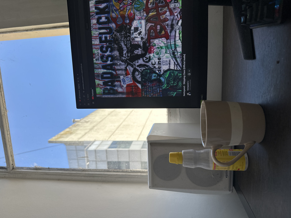 This image captures an indoor perspective looking out through a window onto an urban environment in Buenos Aires, Argentina, on a clear day. In the foreground, a dark desk surface supports a beige ceramic mug with a white horizontal stripe, a white rectangular speaker, and a clear plastic bottle with a yellow cap showing condensation. To the right, a black computer monitor displays a YouTube video titled "Nettspend - Skipping Class [Official Audio]," featuring a collage of graffiti-style art that includes the text "BADASSFUCK," a motorcycle, and a cannabis leaf symbol. A portion of a black computer keyboard is visible at the monitor's base. Beyond the white, worn window frame, a bright blue, cloudless sky dominates the view. Visible exterior structures include a modern building with light and dark checkered panels on the left, and a taller, light-colored building with an angled roofline on the right, characteristic of an urban setting. No individuals are depicted in the scene.