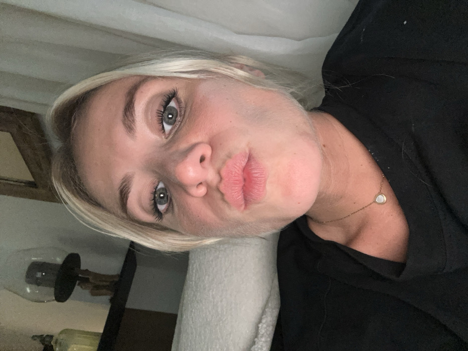 A fair-skinned woman with blonde hair puckers her lips toward the camera