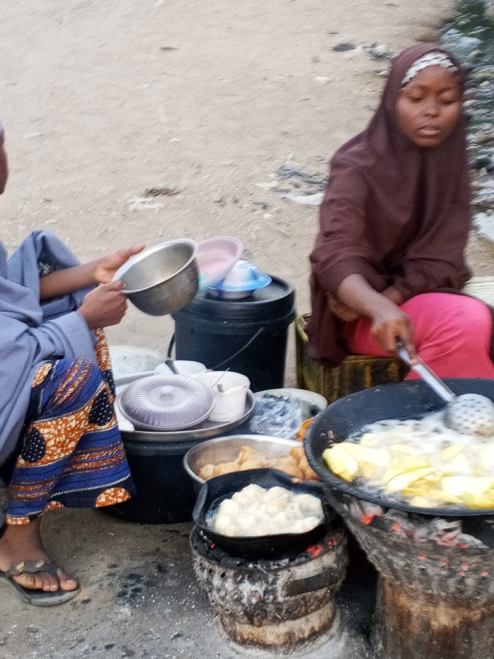 Two people are sitting beside stoves. One wears a blue robe with orange and brown floral patterns. They hold a metal bowl above a black bucket covered in dishes. The second individual, wearing a brown hijab and pink skirt, fries food in a large pan using a slotted spoon. The food is cooked on a charcoal stove. Another smaller pan filled with fried pieces sits atop a second charcoal stove. The setting appears to be an outdoor area.
