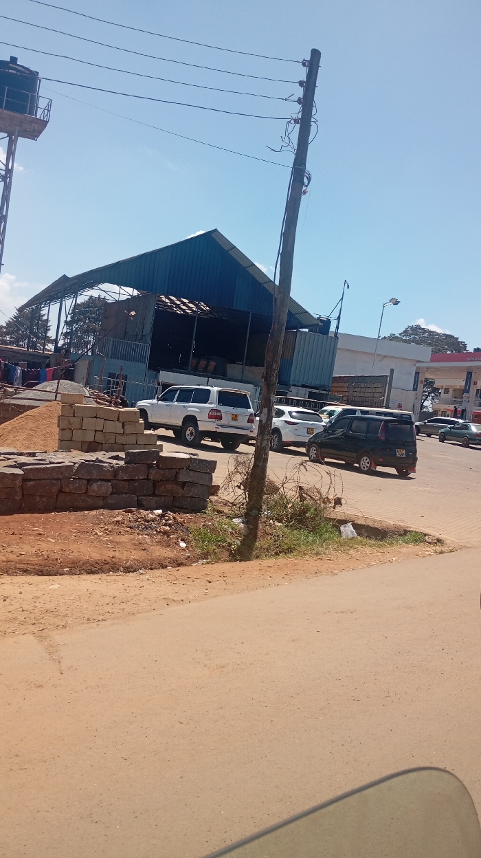 A sunny street scene shows a dirt road in the foreground. Bricks and sand line the side of the road, with several vehicles parked nearby, including a white SUV. Behind the vehicles is a large metal building with a partially collapsed roof. In the background, a gas station is visible. An old wooden utility pole with wires dominates the right side of the image, slightly obscuring the scene. A water tower is on the left. The sky is clear and blue.