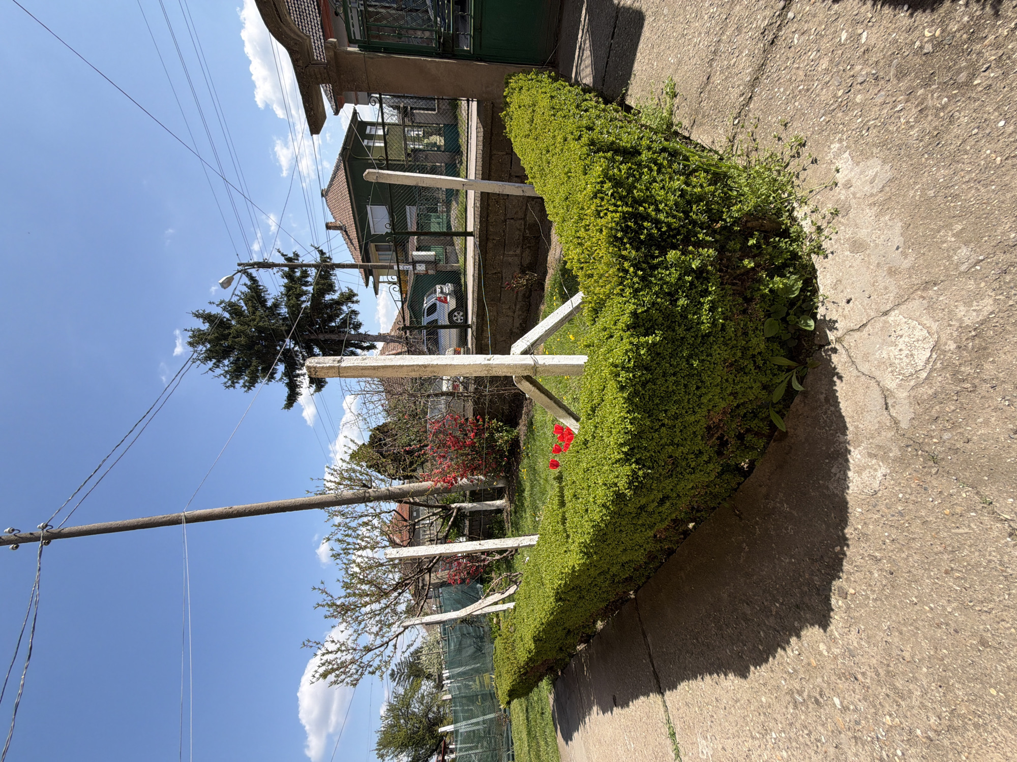 street view in Kutovo, Bulgaria. A trimmed green hedge runs along a concrete sidewalk. Behind the hedge is a white picket fence, and beyond that is a grassy yard with trees, including one with red flowers. Houses with green and brown facades are visible in the background. Overhead are power lines connected to wooden poles. The sky is blue with scattered clouds.