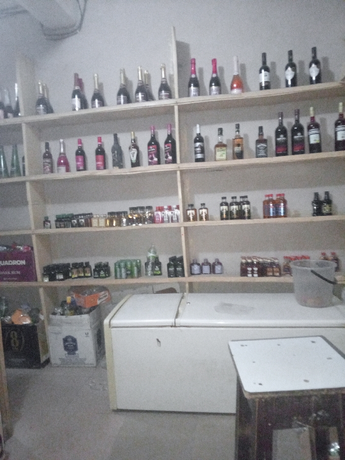 A store showcases shelves stocked with various alcohol bottles, from champagne to whiskey. Below the shelves, a freezer stands alongside assorted goods, including boxes and bottles. A bucket sits on the freezer's surface. In the foreground, a simple stool adds to the setting of a small shop interior.