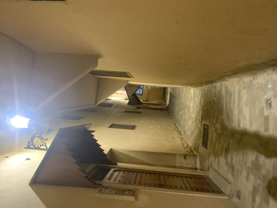 A narrow alleyway framed by tall buildings with light-colored walls. Ornate wooden doors and windows line the facades, some with decorative awnings. A street lamp casts a bright glow, illuminating the scene. The ground is paved with light-colored stones. The perspective looks upwards, emphasizing the height and confinement of the alley. Air conditioning grates are visible on the wall.