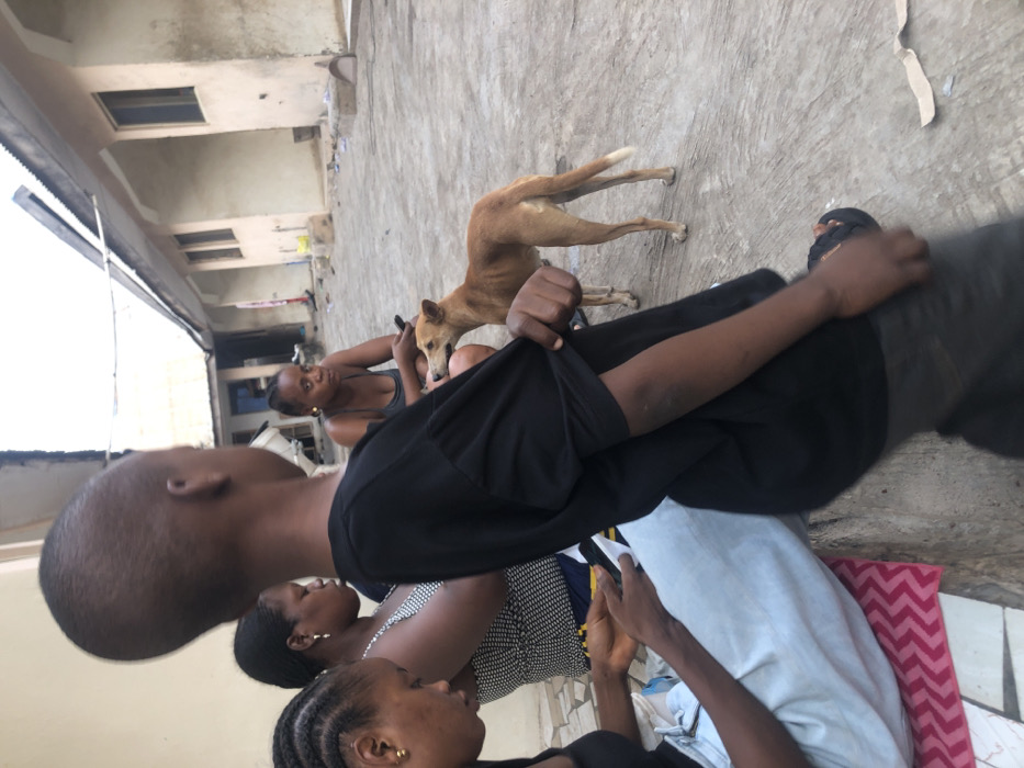A group of people sit outdoors in a concrete area. A dog stands behind them. Three women are visible, one wearing a gray tank top and another with braided hair. A person in a black t-shirt is in the foreground, partially obscuring the view. The background includes a building with windows. There's also a pink and white chevron patterned mat near the bottom right of the image. The overall composition seems casual.