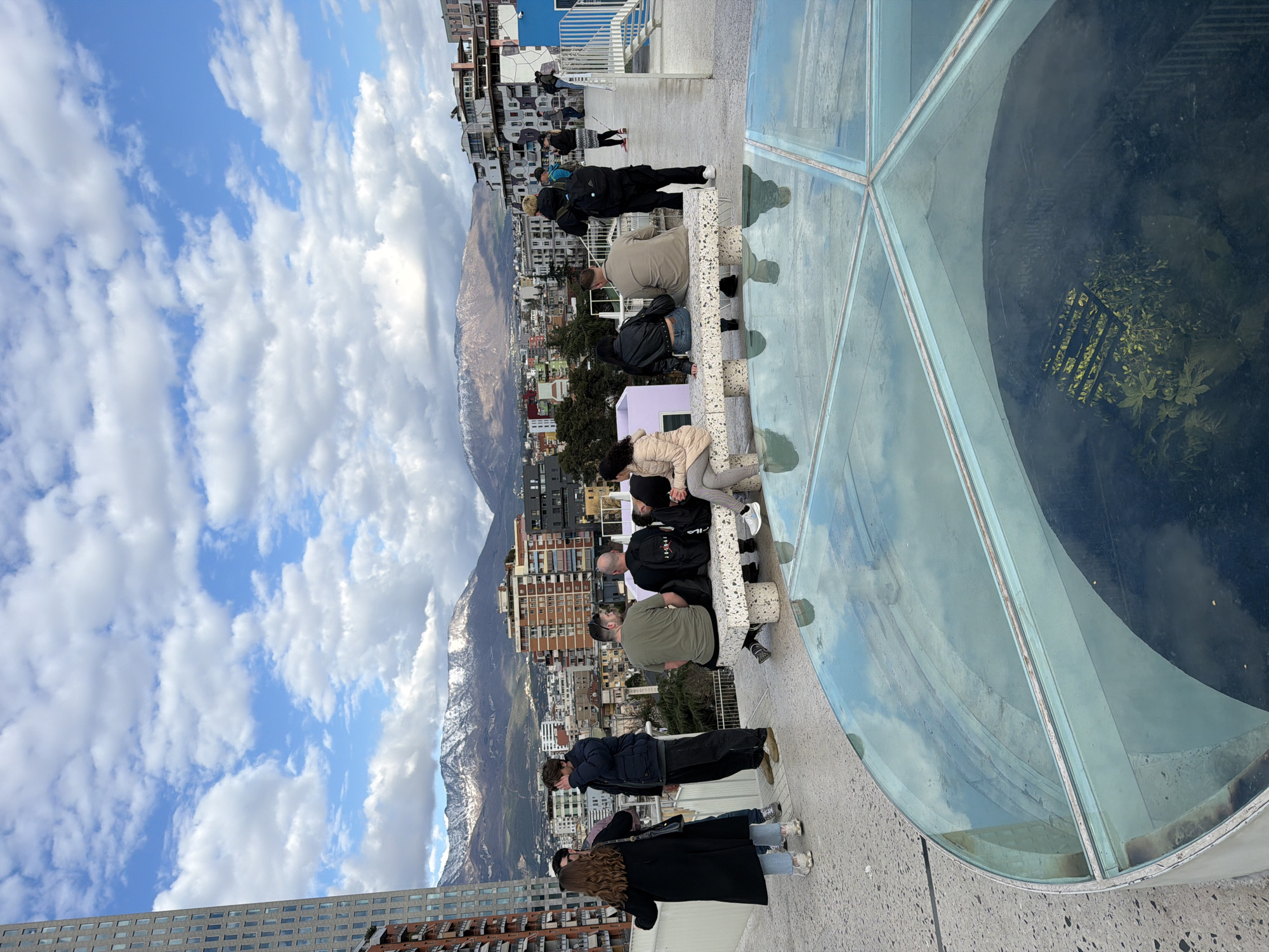 The photo shows a group of people on a rooftop observation area overlooking the city of Tirana, Albania