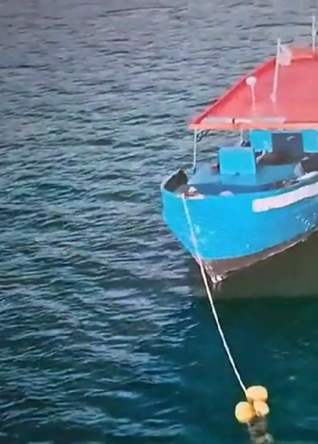 two scenes. The first scene is an aerial shot of a large stone building with a dome and a clock tower. The building is situated in a town with other buildings and a rural landscape in the background. The second scene is an aerial shot of a small, colorful boat bobbing on a body of water. The boat is primarily blue with a red roof. It is tethered by a rope.