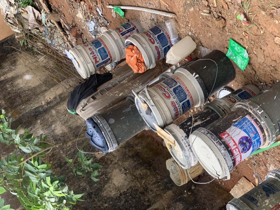 The image depicts an outdoor scene in Amaeshi, Nigeria, characterized by an accumulation of discarded and used materials against a weathered concrete wall