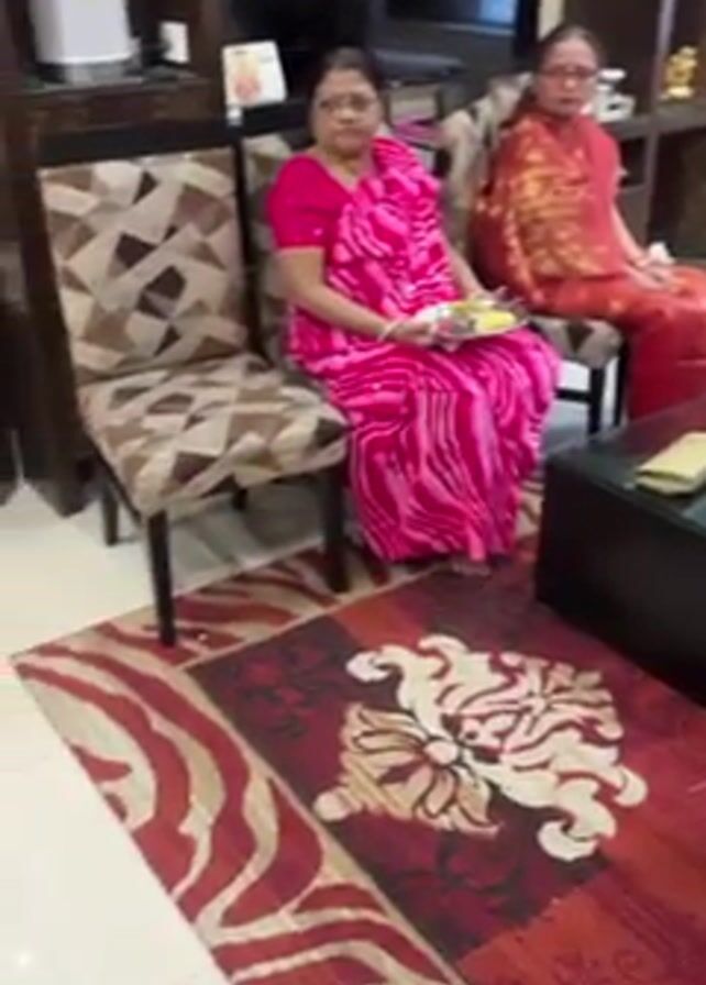 four women in a living room, dressed in traditional Indian saris. One woman is seated on a chair, wearing a pink sari. Another woman is sitting to her right, wearing an orange sari. A third woman is sitting across from them, wearing a pink sari. The fourth woman walks across the room, wearing a red sari and carrying a small plate. There is a coffee table in the center of the room with a tray of small bowls on it. The room is decorated with a patterned rug, a television, and a decorative cabinet. The lighting is warm. There is music playing.