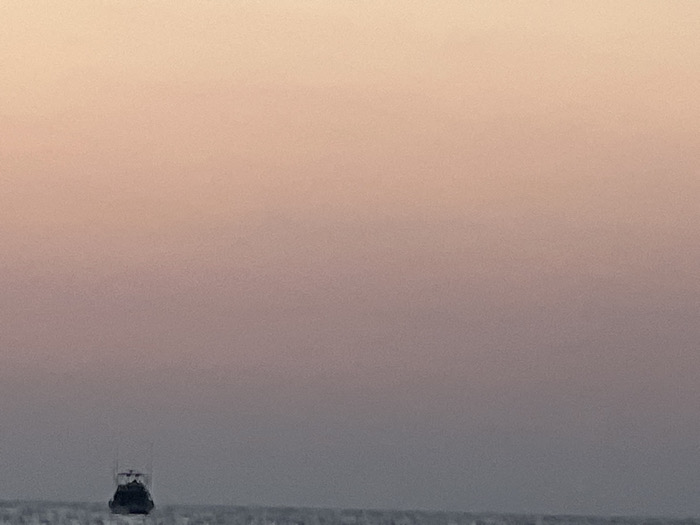 A boat is visible on the water in the lower portion of the frame, silhouetted against the horizon. The sky fades from a pale pink at the top to a deeper greyish tone near the water. The light is muted and appears to be dawn or dusk. The overall image conveys a sense of calm and tranquility.